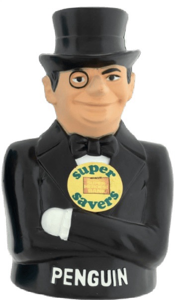 Mego released a series of five plastic banks in 1974 called the “Super Saver Banks”. The characters included Batman, Joker, Penguin, Spiderman and Superman. Originally, each bank came with a yellow “Super Saver” sticker on the front and in a plastic baggie. There was a rubber stopper on the bottom of each bank to allow to empty your money and buy more Mego Toys!