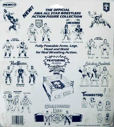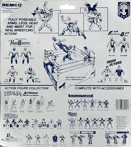 The 1980’s witnessed an unprecedented surge in popularity for professional wrestling, with larger than life characters and captivating storylines. Promotions like the AWA played a significant role in the wrestling landscape, featuring legendary names like Ric Flair and the Road Warriors. Since LJN Toys secured the licensing rights to the WWF, Remco snatched up the AWA’s rights. Remco was a well established toy manufacturer at the time, and knew how to market action figures. Each figure was designed to resemble the AWA wrestlers, complete with facial features, colorful costumes and accessories. They were made of a solid plastic, with moveable waists, legs, arms, and heads. Unlike rival LJN, Remco decided to market their figures as two-packs and three-packs, except for the final wave of singular figure releases.