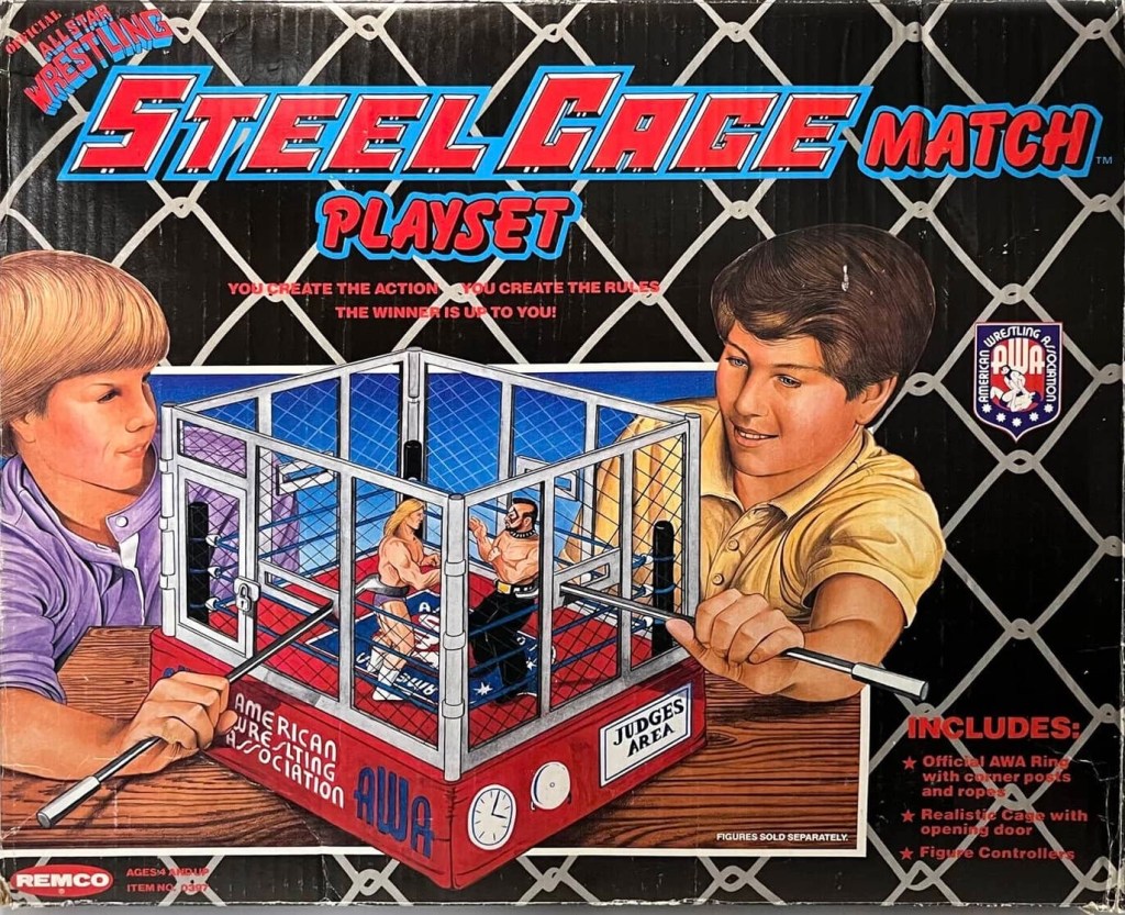 Remco released three scaled playsets for their AWA action figure line, and they were the All-Star Wrestling Ring, Battle Royal Wrestling Ring and the Steel Cage Cage Match Playset. A Championship Belt was also released for dual purpose roleplay, because it could also carry five action figures on it.