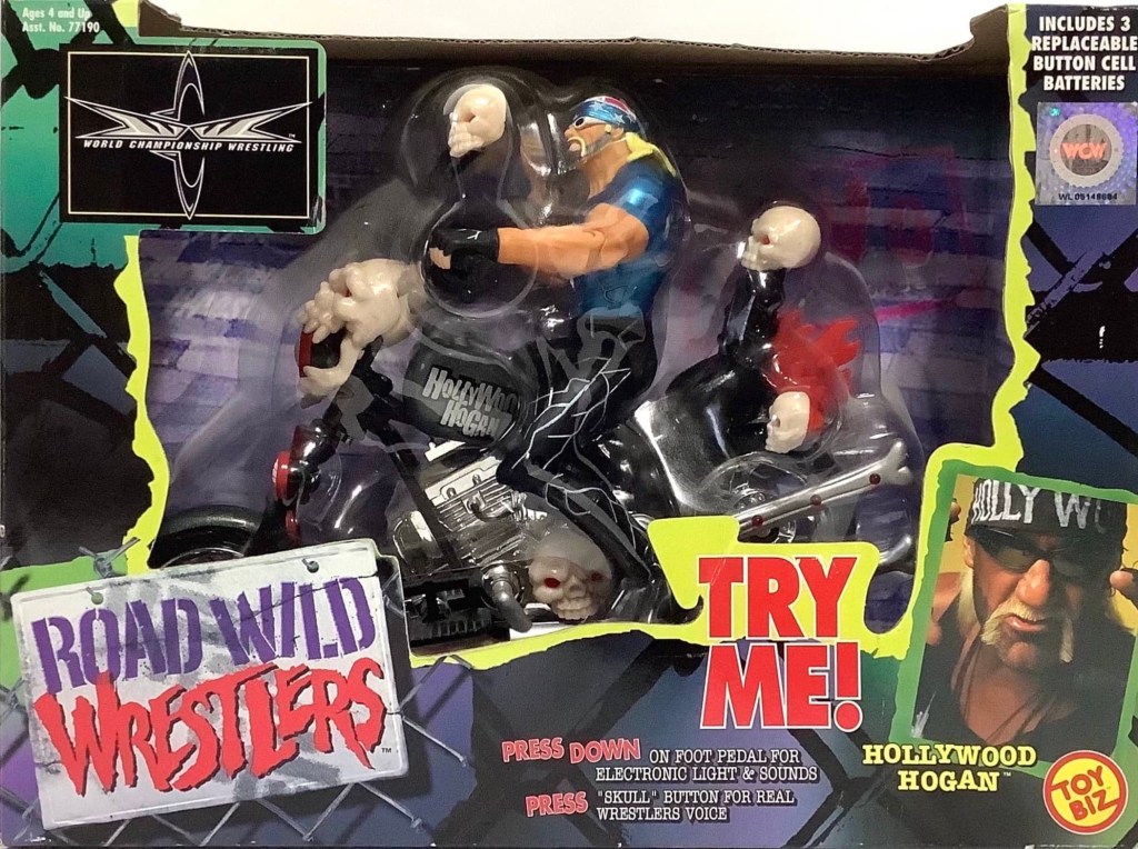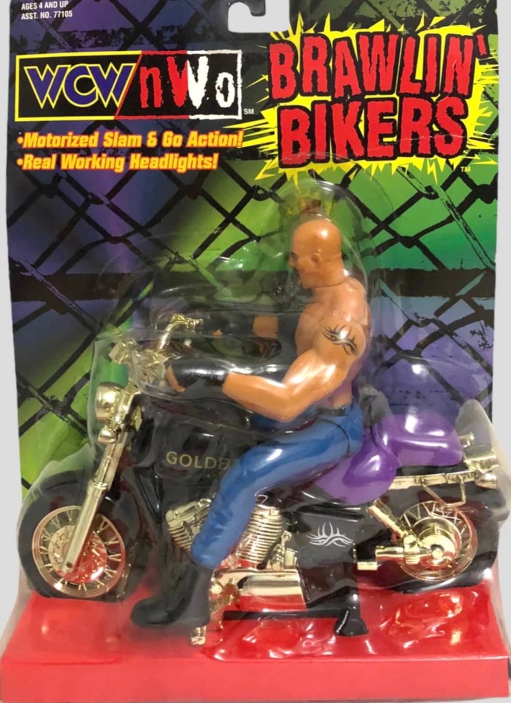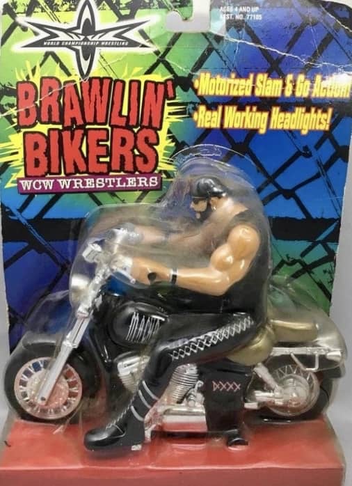 The Brawlin’ Bikers included a wrestler atop a motorcycle. Included were such big names as Hulk Hogan, Macho Man Savage, Goldberg, DDP and Sting.