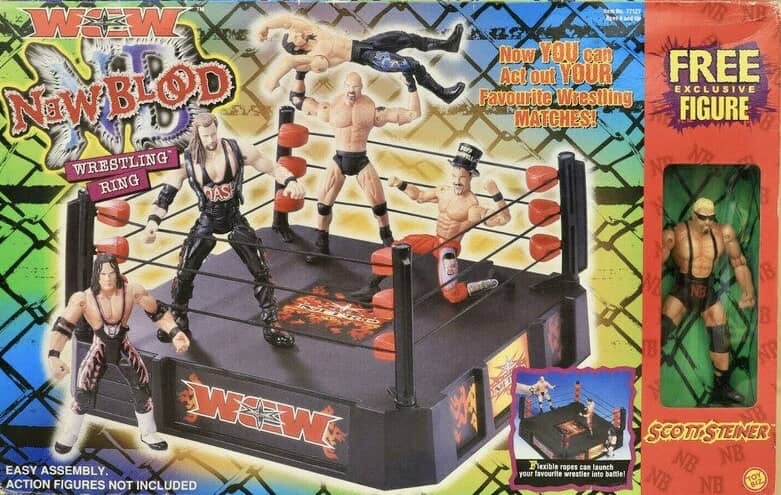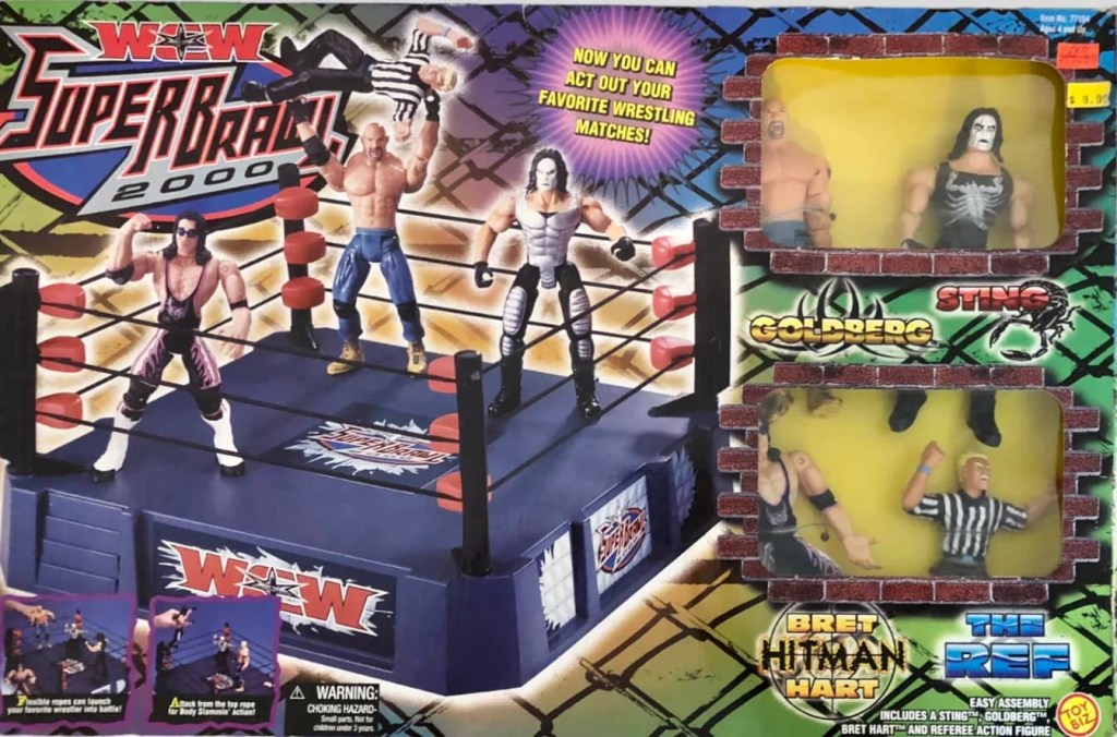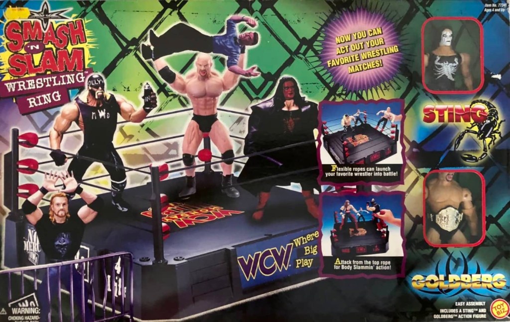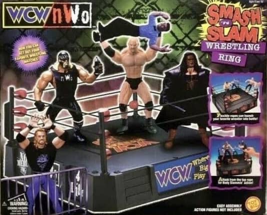 Toy Biz released several different versions of Wrestling Ring playsets from their WCW action figure line from 1999 to 2001. There were two versions of their Electronic Monday Nitro Arena set, as well as three versions of the Smash ‘N Slam Wrestling Ring, a Bash at the Beach Ring Playset, the New Blood Wrestling Ring and a Super Brawl 2000 set.