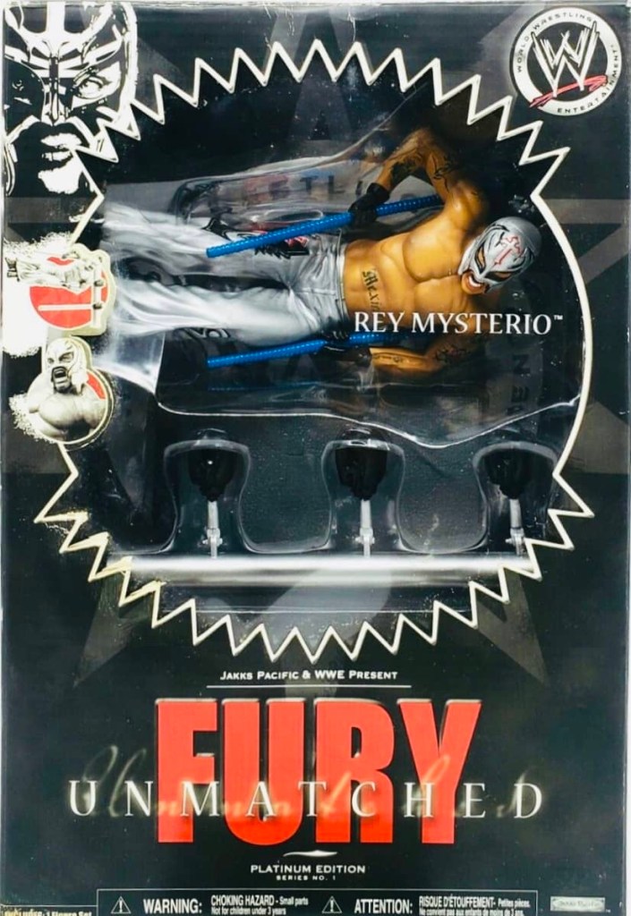 The Champions of WrestleMania series was a small line of figures with matching masks of only one character….and that was Rey Mysterio. There were three versions of Rey with masks matching his tights.