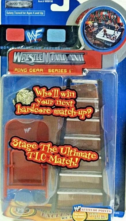 The Grapple Gear series was a small line of Accessory Packs for use with any of the Jakks Pacific action figures. A new Prop Box series was introduced in 2000 that contained even more accessories for our favorite wrestlers. If that wasn’t enough, Jakks also gave us some additional accessories for their many wrestling rings with the Ring Gear Accessory Sets.