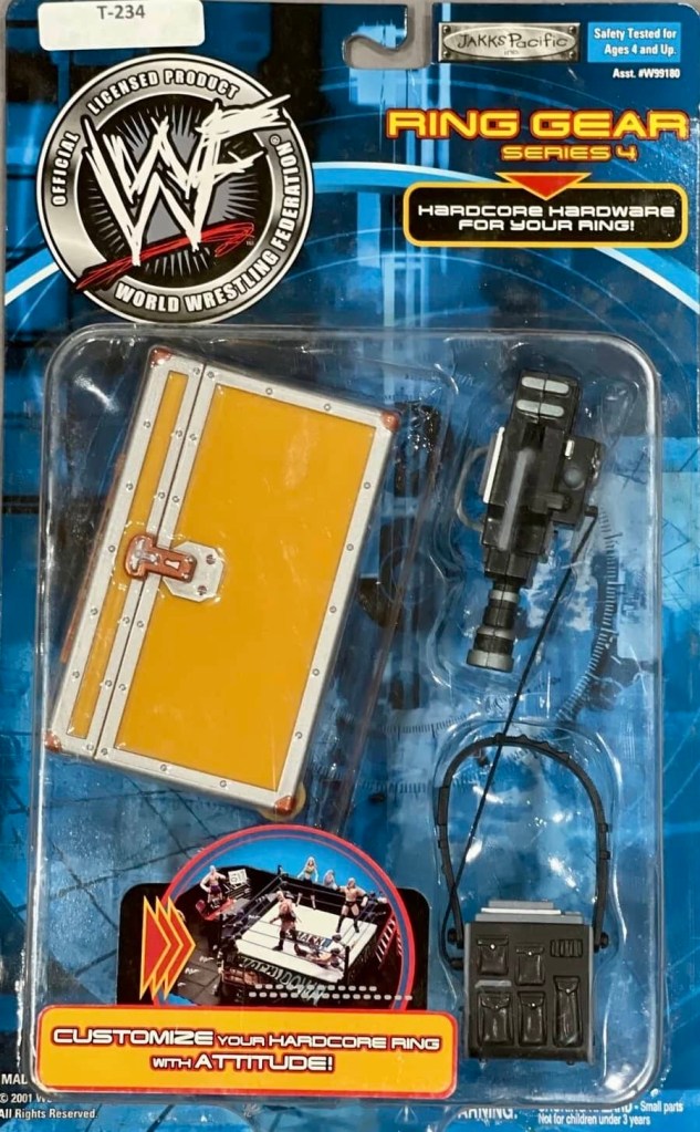 The Grapple Gear series was a small line of Accessory Packs for use with any of the Jakks Pacific action figures. A new Prop Box set was introduced in 2000 that contained even more accessories for our favorite wrestlers. If that wasn’t enough, Jakks also gave us some additional accessories for their many wrestling rings with the Ring Gear Accessory Sets.