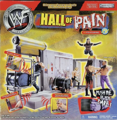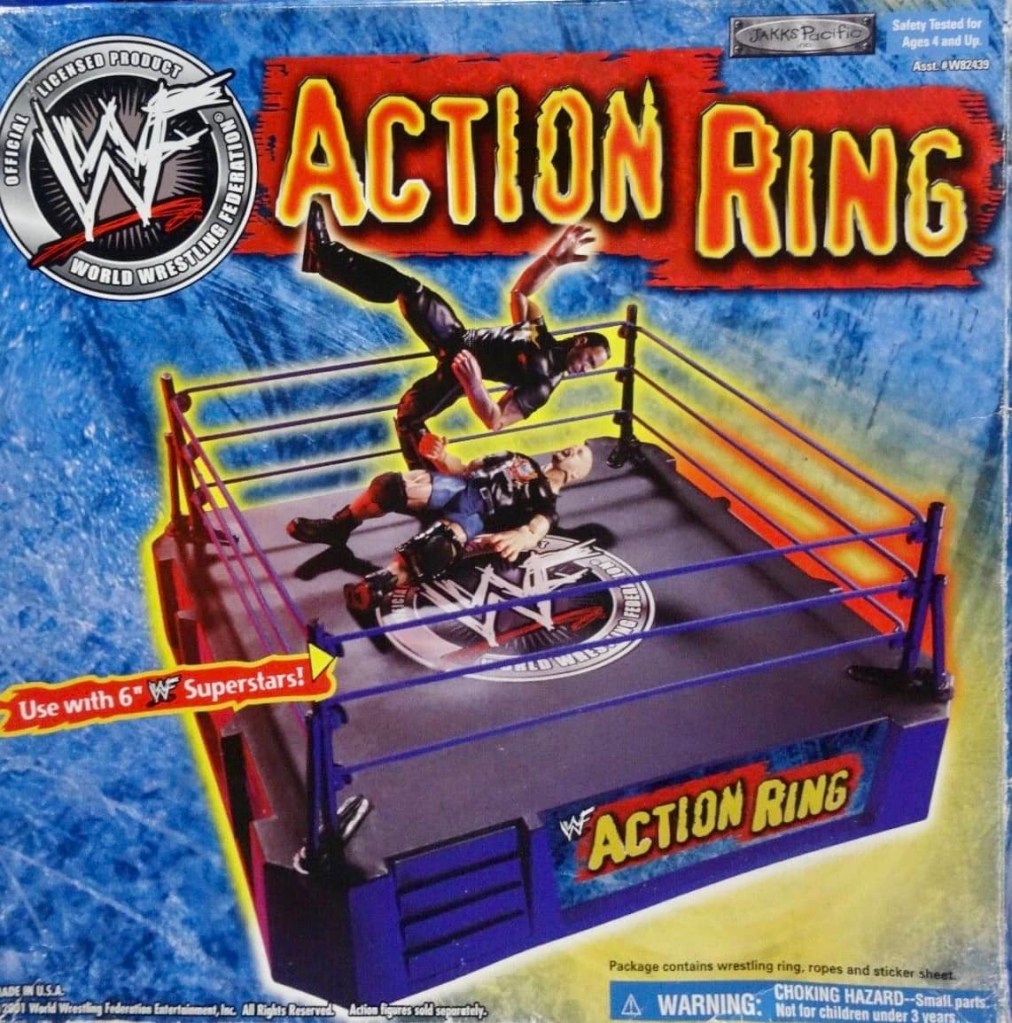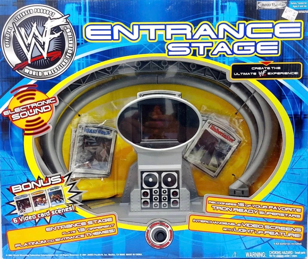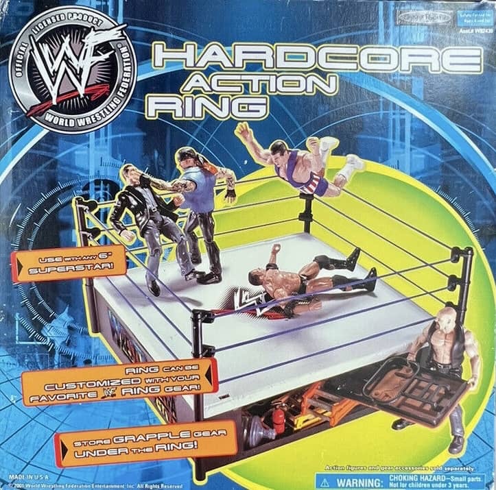 Jakks Pacific released several different versions of Wrestling Ring playsets from their WWF action figure line through the years, and 2001 was no different. There was a new Action Ring Playset, as well as two versions of the Entrance Stage Playset and three versions of the Hardcore Action Ring. Also released was a new Rage in the Cage Playset, Raw is War Stage, Real Sounds Arena, SmackDown Sounds Arena and a couple of new R-3 Tech playsets.