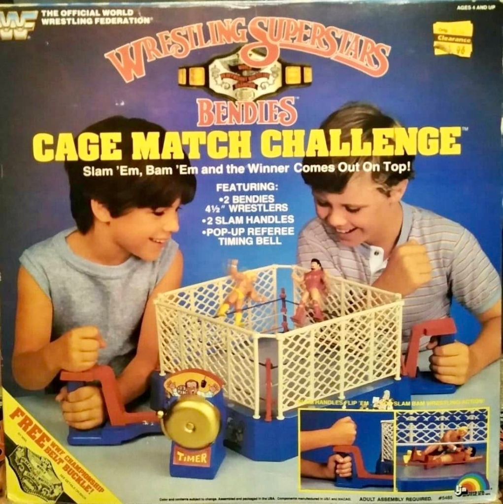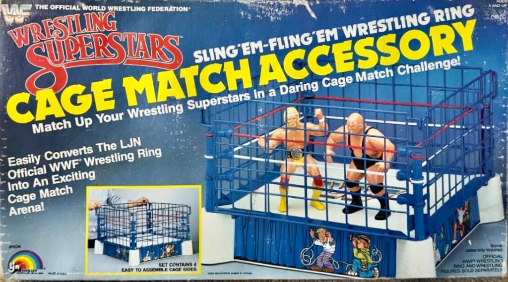 LJN released one scaled playset for their WWF action figure line, and that was the Sling ‘Em-Fling ‘Em Wrestling Ring in 1985. The Cage Match set was an add-on to the wrestling ring playset. Sidenote: The Sling ‘Em-Fling ‘Em Wrestling Ring was actually recalled in 1991 due to safety concerns, even though LJN had already went out of business at the time, further driving the demand for the popular playset.