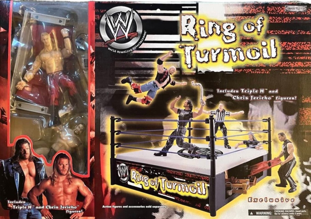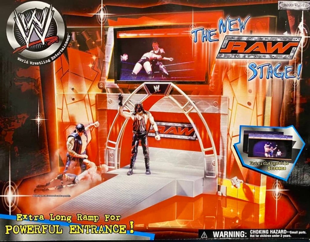 Jakks Pacific released several different versions of Wrestling Ring playsets from their WWF action figure line through the years, and 2002 was no different. There were two new RAW Stage Playsets, as well as a new Raw Entrance Stage Playset. In addition, we got the Backlash Action Ring, Metal Vengeance Arena, NWO Match, Ring of Poison, Ring of Turmoil and the Stage of Rage.